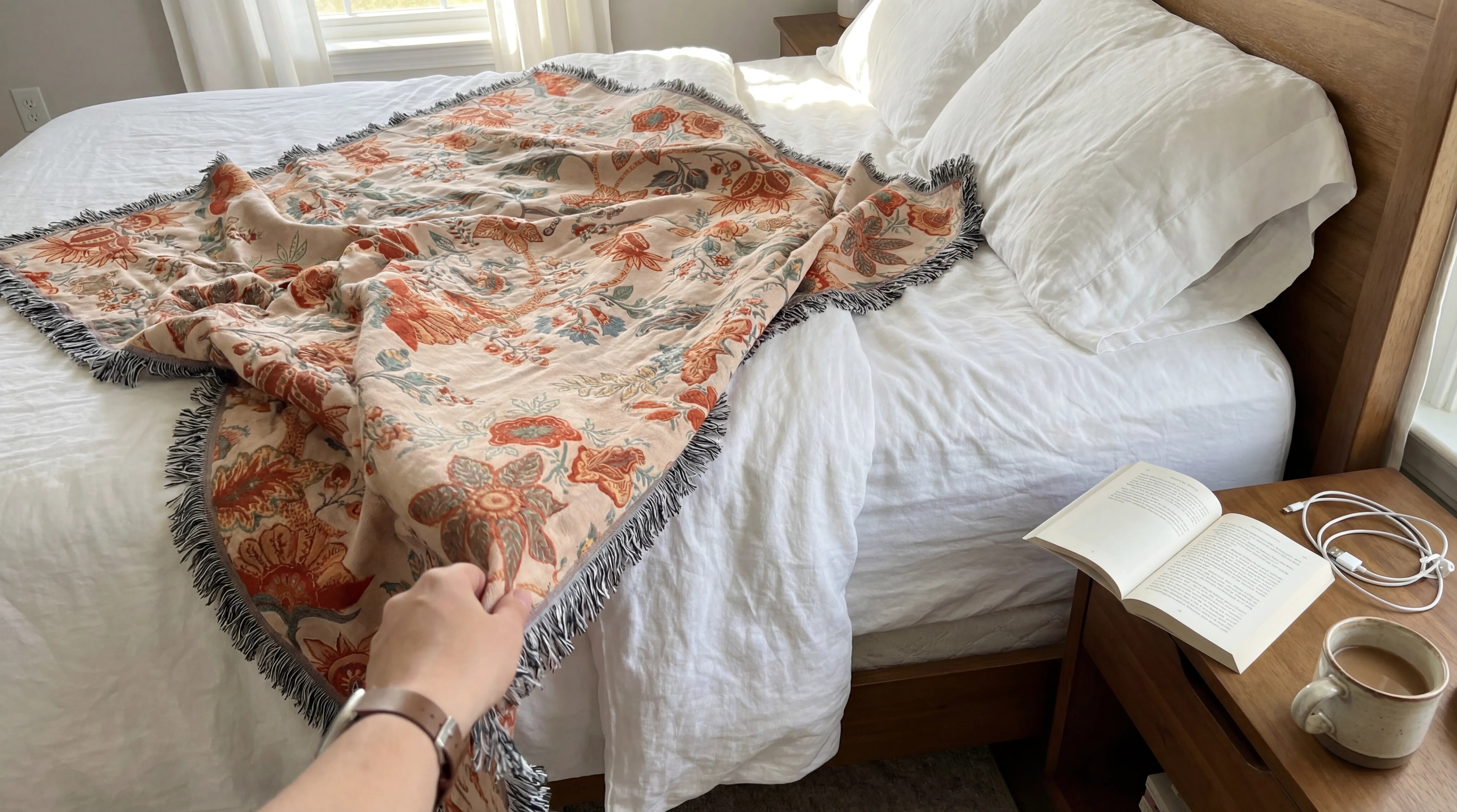 No perfect folding required — toss it over a couch, chair, or bed and it instantly upgrades the whole room.